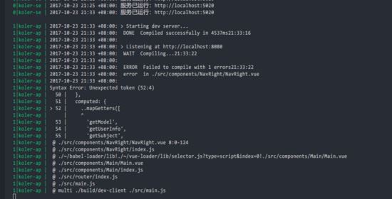 现在我们更改代码发现没有任何问题,pm2会帮助我们自动进行热更新。现在我们故意改错一段vue的代码试试:
