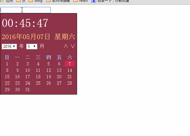 该日历主要实现了获取当前时间时分秒,年月日星期,动态生成选择年的select,月的select,然后根据你所选中的年月,显示该年月对应的这一个月的日期。