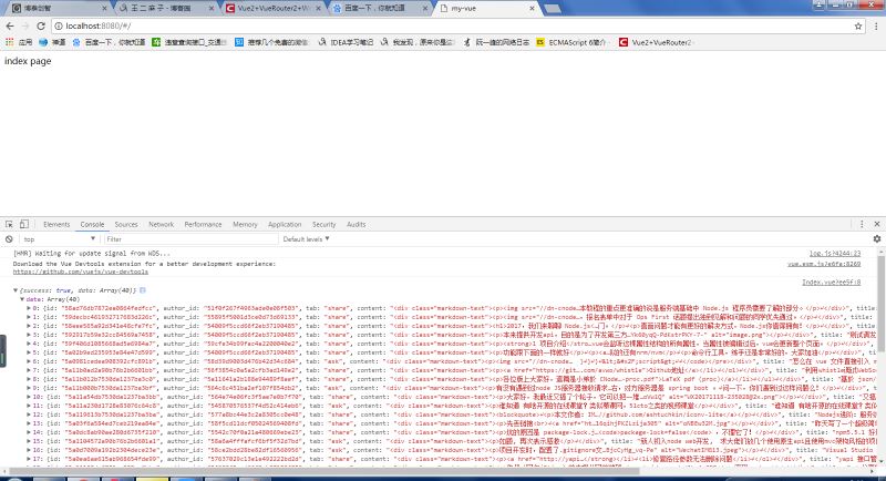 我们在Index.vue中向浏览器的控制台输入一些接口请求到的数据,如果你和我也一样,那说明我们的接口配置完成正确。如下图: