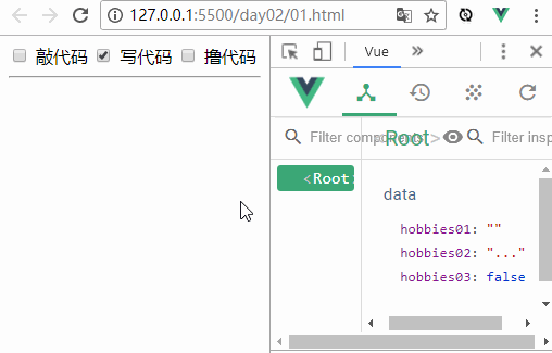 <body> <div id="app"> <!-- v-model 绑定的是基本类型 --> <input type="checkbox" name="hobbies" id="box01" value="敲代码" v-model="hobbies01"> <label for="box01">敲代码</label> <input type="checkbox" name="hobbies" id="box02" value="写代码" v-model="hobbies02"> <label for="box02">写代码</label> <input type="checkbox" name="hobbies" id="box03" value="撸代码" v-model="hobbies03"> <label for="box03">撸代码</label> <hr/> </div> </body>