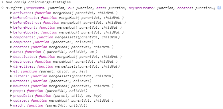 用于自定义选项的合并策略,Vue已经预定义了一些自己配置项的合并策略,如下图所示。