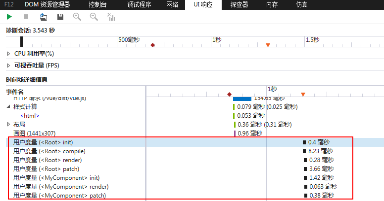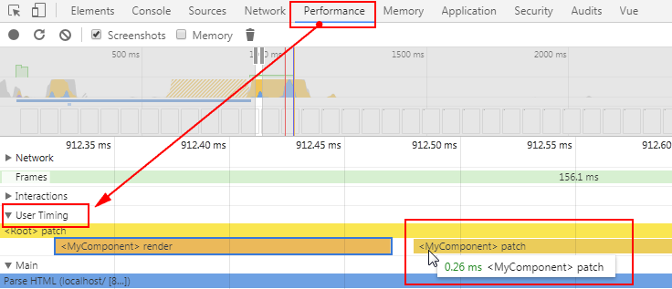比如在谷歌浏览器中查看自定义组件Vue.component('my-component')的各个阶段花费的时间: