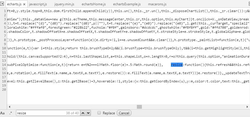 到echart官网看了Example,发现官网的实例都具有响应式功能,确实不是单纯的宽度改变,是每次调整后图表是重新绘制。猜想echart源码里应该有resize这个API,打开调试器,打开echart源码,Ctrl+F,果然找到了。