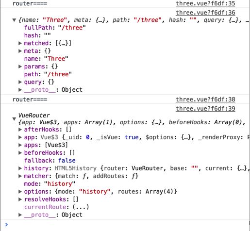 在 three 页面中打印路由相关信息,如下: