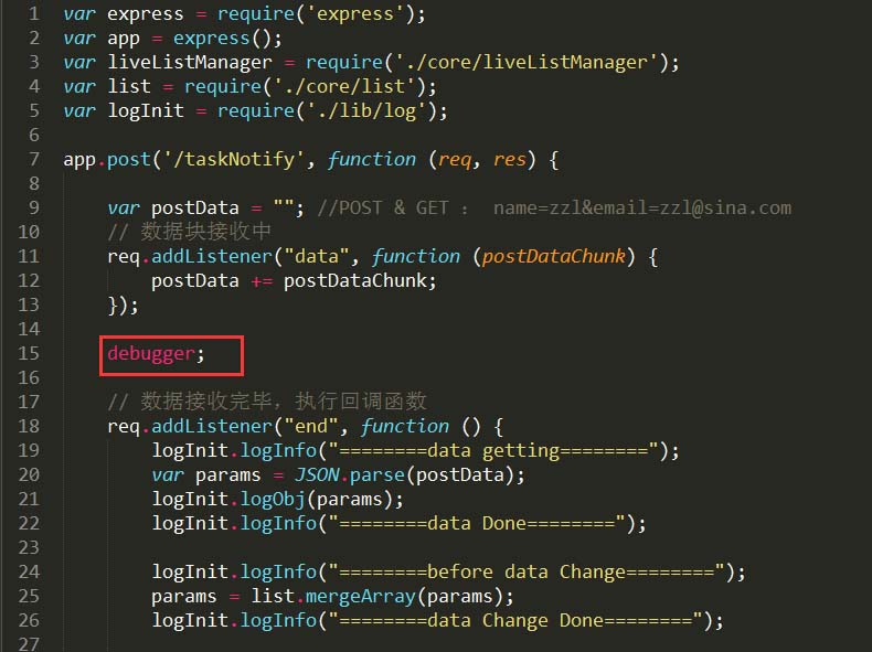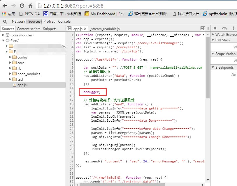 4.打开想要debug的js文件例如app.js,在代码中打上断点:debugger;例如: