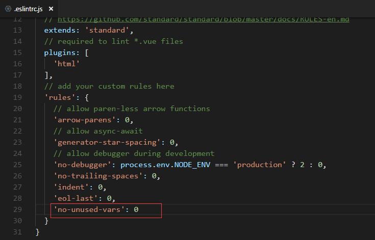 其实 eslint 代码检查是非常好的,不仅规范个人的js书写,在团队多人协作开发中,更是起到了非常重要的作用。但有时候,这些规则有点过于死板,比如声明一个未使用的变量就会报错 “no-unused-vars”,想要关闭这个规则的话,可以打开 eslintrc.js 文件,将对应的规则改为0,即可关闭