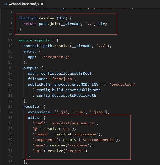 这里是通过调用 resolve 方法来达到简化路径的目的,比如可以直接用@来取代src,也可以直接写 "api/xx.js",而不用一层一层的去找