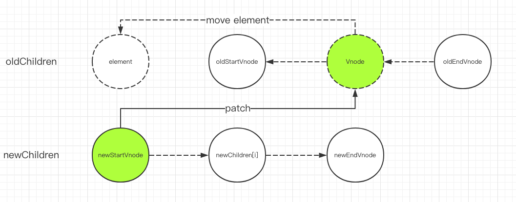 如果newStartVnode和oldEndVnode是同一节点,调用patchVnode进行patch,如果removeOnly是false,那么可以把oldEndVnode.elm移动到oldStartVnode.elm之前,然后把newStartVnode设置为下一个节点,oldEndVnode设置为上一个节点,重复上述流程