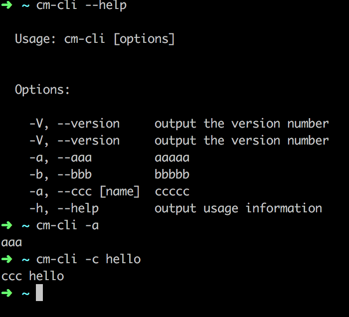 .option('-c, --ccc [name]', 'ccccc')