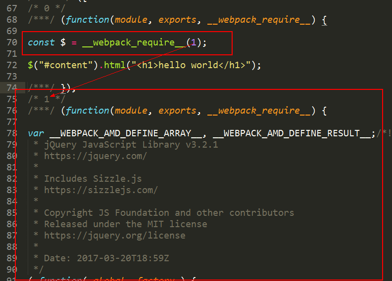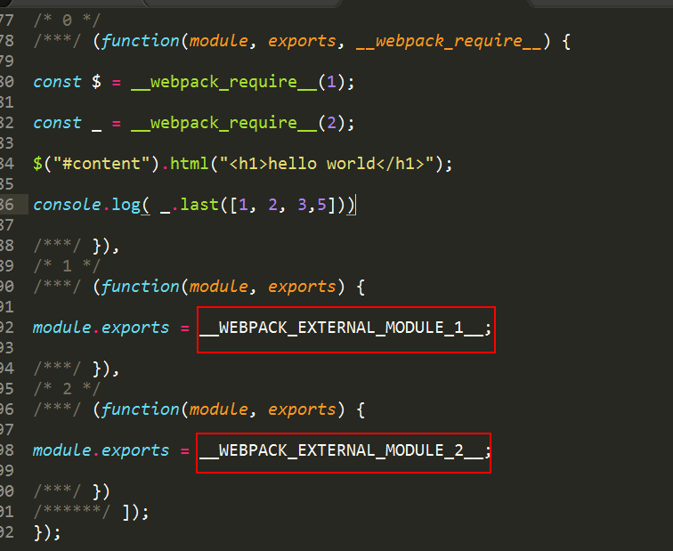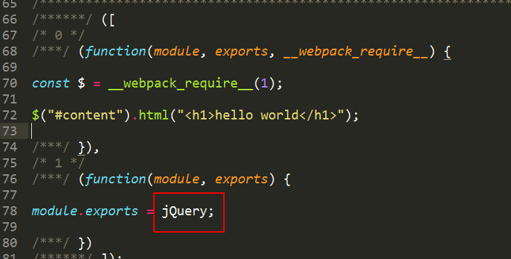 这里的/* 0 */和__webpack_require__分别指打包前js对应的模块函数,这里就不细说了。这里可以看到module.exports = jQuery,就是说我们externals中的key指的是require的东西,value指的就是它,就是说“当require的参数是jquery的时候,使用jQuery这个全局变量引用它”。这种最简洁的externals配置方式为默认的global模式,就是在window上挂一个全局变量,然后直接可以使用这个变量。具体的流程是这样,我们在源码中使用require('jquery')后,可以直接把jquery加到externals中,得到一个打包的trunk.js,但是在引入这个trunkjs之前,肯定要先引入jquery这个库文件,这个库文件会创建一个全局变量jQuery,而咱们的trunkjs中externals的jquery是global模式,所以实际上trunkjs引入jquery的时候,就会从全局变量中引用,即module.export = jQuery