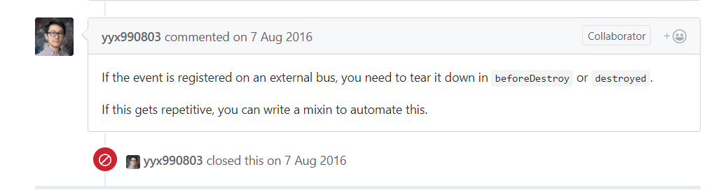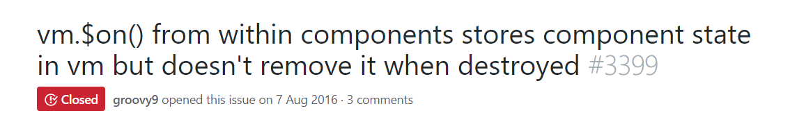 *就是说,这个$on事件是不会自动清楚销毁的,需要我们手动来销毁。(不过我不太清楚这里的external bus 是什么意思,有大神能解答一下的吗,尤大大也提到如果是注册的是external bus 的时候需要清除)****