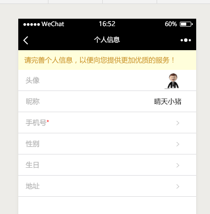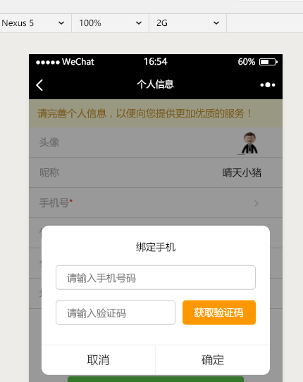 今天要实现的功能是在 完善个人信息页面(vue)中添加手机验证码组件,当用户点击 手机选项时,弹出获取验证码组件,完成验证手机的功能: