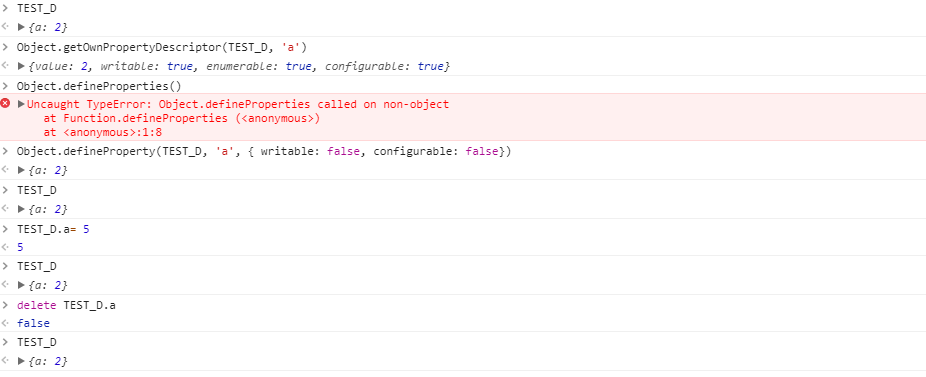 删除之后继续添加a属性时,a又变成可改的了。上述只是将a属性的可写属性改了,还有一个configurable属性可以进行设置。writable属性只是将对应的属性变更为不可直接更改,但是可以走小路(先删除在添加)。
