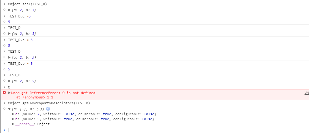 利用上述两种方法循环使用是可以去创建常量的,但是比较复杂,而且当对象比较大的时候,代码量会比较大。Object.seal()可以简化这个过程。这个方法可以将对象变得不可扩展,属性不可删除。在此基础上在将对象的所有属性的描述符writable改为false就能得到我们要的变量了,即所谓常量。