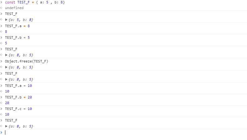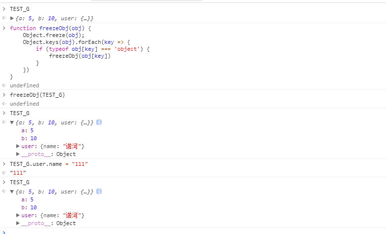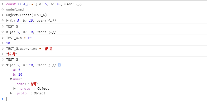 4) Object.freeze: 该方法可以冻结一个对象,冻结指的是不能向这个对象添加新的属性,不能修改其已有属性的值,不能删除已有属性,以及不能修改该对象已有属性的可枚举性、可配置性、可写性。也就是说,这个对象永远是不可变的。该方法返回被冻结的对象。