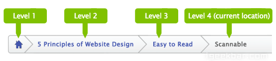 使用面包屑导航的原则是展示网站的结构而不是用户的访问历史。因此,尽量使用基于位置和属性的面包屑导航而不是基于路径的。