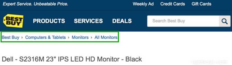 在下面这个例子(BestBuy网站)中,每一个链接都代表一个页面,从左至右逐级深入。