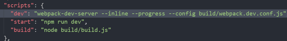 对比下就知道 当我们运行npm run dev 实际上是执行了webpack-dev-server –inline –progress –config build/webpack.dev.conf.js