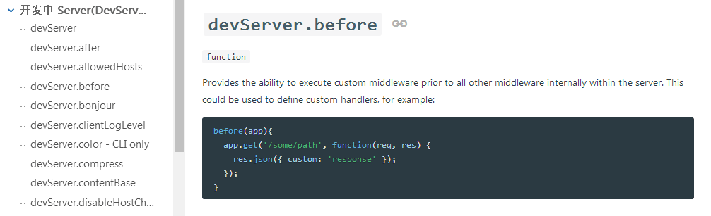 现在我们的要求就是怎么在服务开启的时候接口数据也对应做好呢,那我们查看其插件API 刚好有一个参数就是devServer.before