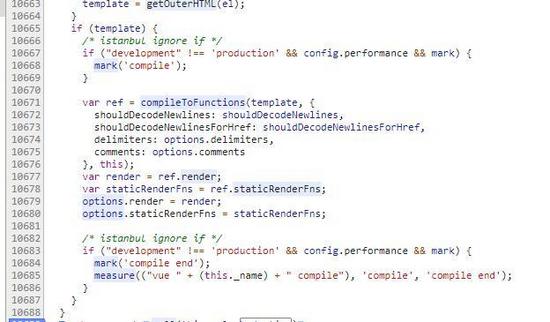 我们呢可以看到,代码首先判断option里面有没有render函数,没有的话,进一步判断有没有template,没有的话就用dom元素的outerHTML。得到template以后干什么了呢?如下图。