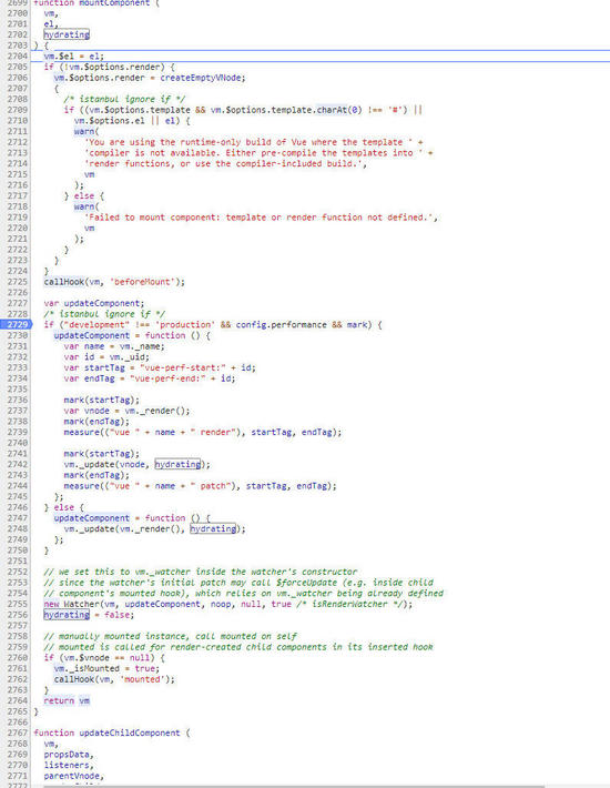 具体的将template解析成ast语法树在本文就不说了,有时间单独开一个章节分析。好,这下我们拿到render函数了,那么接下来一步干什么了呢?没错,就开始 mountComponent 了。如下图: