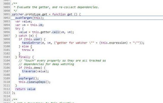 也就是说如果当前有 Dep.target 的话,就把target放到 targetStack 里面,如果没有的话,就设为当前的target,也就是这个watcher。 接着,就是执行了它的 getter 属性,也就是刚刚传入 updateComponent 函数。而 updateComponent 就是我们开篇提到第三步了。