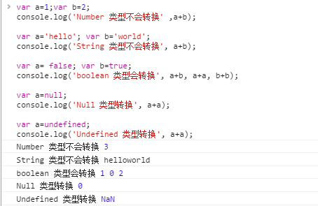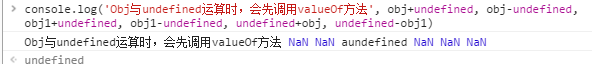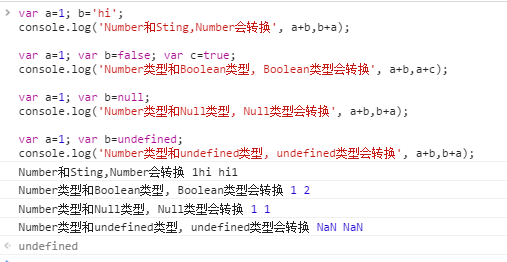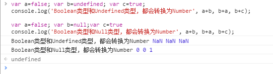 总结: 当加号运算符时,String和其他类型时,其他类型都会转为 String;其他情况,都转化为Number类型 , 注: undefined 转化为Number是 为'NaN‘, 任何Number与NaN相加都为NaN。