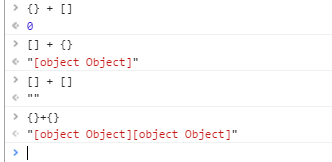 为什么 {} + [] = 0 ? 因为 javascript在运行时, 将 第一次{} 认为是空的代码块,所以就相当于 +[] = 0. 还有 {} +5 = 5, 同理。