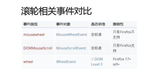 wheel 事件是 DOM Level3 的标准事件,但是除了此事件之外,还有很多非标准事件,不同的浏览器内核使用不同的标准,所以可能还需要按情况来进行兼容,具体可见MDN MouseWheelEvent