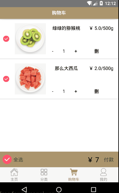 简单的说,先获取水果的名称name,然后再去判断Mobx的CartStore里面是否存在同样的名称的水果,如果有就增加对应name的数量count,如果没有,就往CartStore中增加数据,切换到购物车页面时,视图会同步刷新,看到已加入购物车的水果。