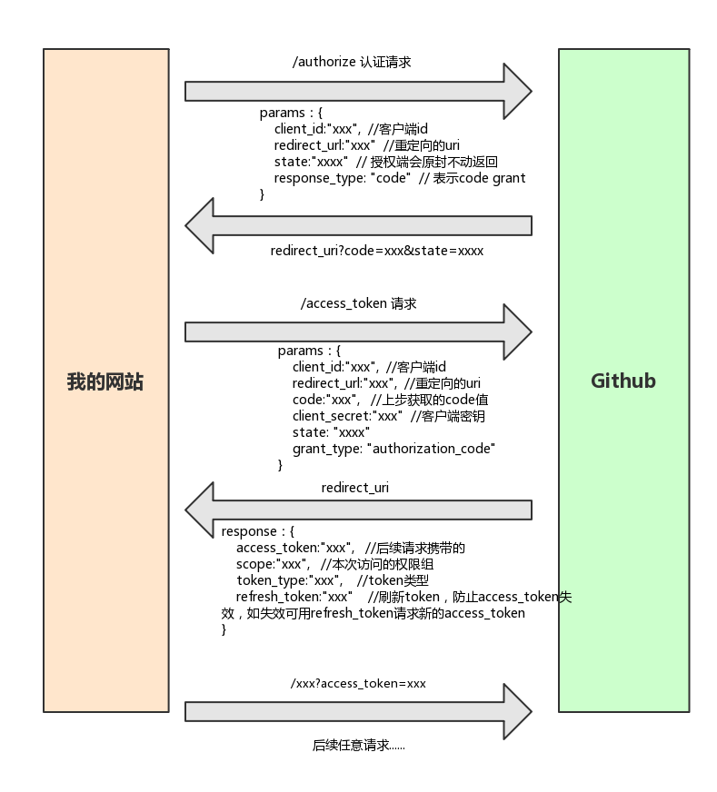授权码模式是最为严密的授权模式,整体流程为:浏览器携带必要信息至授权页面,正常登录成功后,返回一个code(授权码),客户端拿到code后在后台获取拿code换取token。