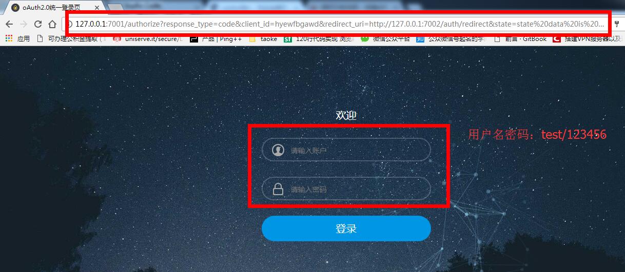 可以发现,浏览器重定向到授权服务地址,并携带了response_type、client_id、redirect_uri三个参数,登录成功后,浏览器会重定向到redirect_uri指定的地址,即这里的*http://127.0.0.1:7002/auth/redirect*: