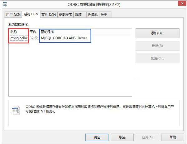 2、javascript也是通过odbc连接mysql,和php不同的是,其中一个参数,图片中,红色的是php的连接数据源名,蓝色的是javascript连接数据源名,这里非常容易误导。