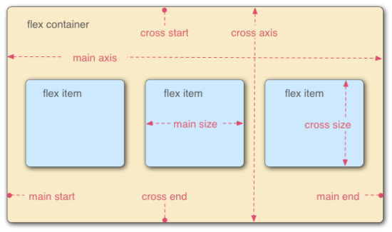 项目默认沿主轴排列。单个项目占据的主轴空间叫做main size,占据的交叉轴空间叫做cross size。