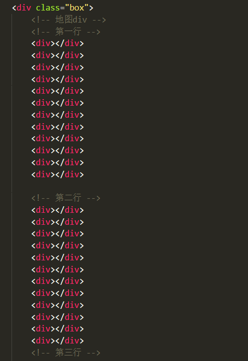 html结构十分简单,只要弄一堆div,来放置地图的class就可以了,我这里初始化了12*9个div,地图里最多九行高度。
