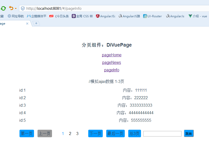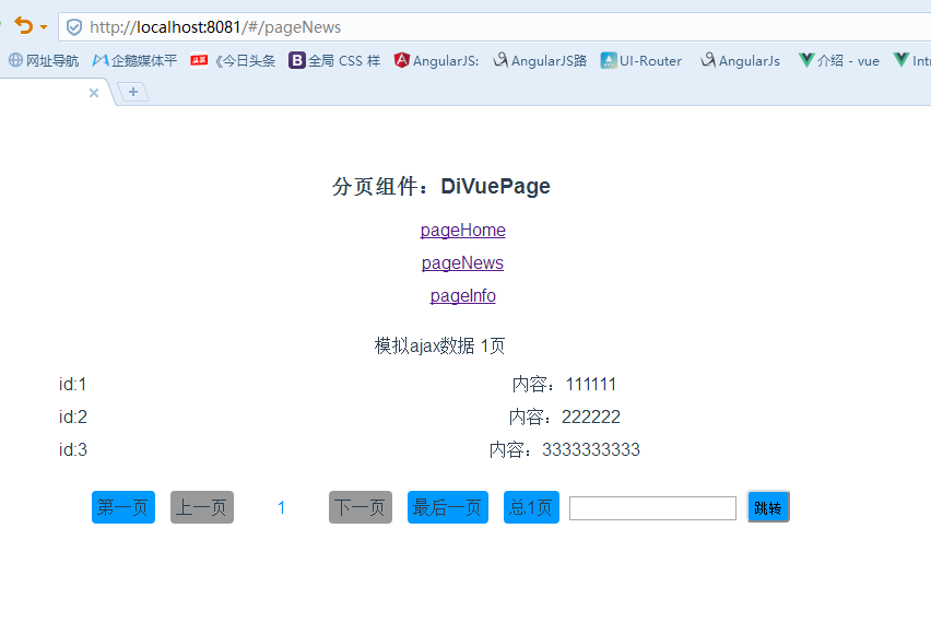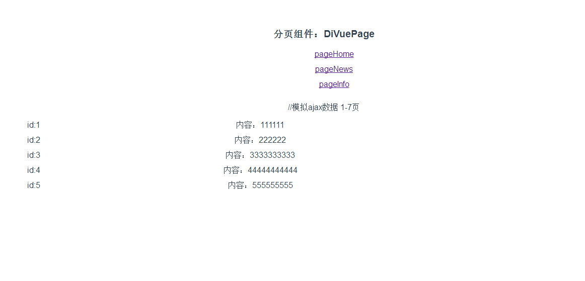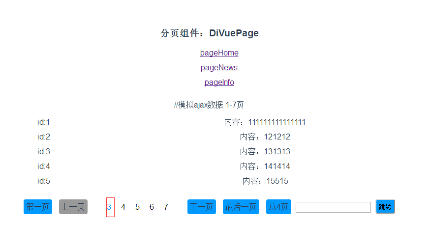我们现在在pageHome.vue做了使用,这个模拟数据包含7页,我们在另外两个组件也使用分页组件,测试小于5页和只有1页的效果: