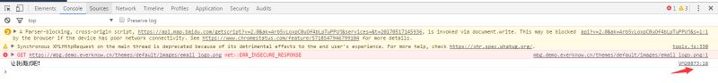 2、第二种方法是利用 console.log("让我调试吧!") 打印日志,在浏览器console里看到输出后,点击后面的链接,即跳入动态脚本。名字一般为vmXXX,如下图: