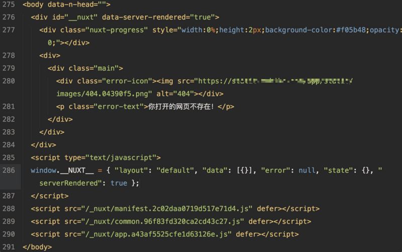 多数是基于webpack构建的项目,编译出来的html文件,资源文件都被打包到js中,以下图404页面代码为例。从代码中可以看出,这样的页面是不利于 搜索引擎优化(SEO, Search Engine Optimization) ,并且 内容到达时间(time-to-content) (或称之为首屏渲染时长)也有很大的优化空间。为了解决以上问题,引入了 Nuxt.js 框架。
