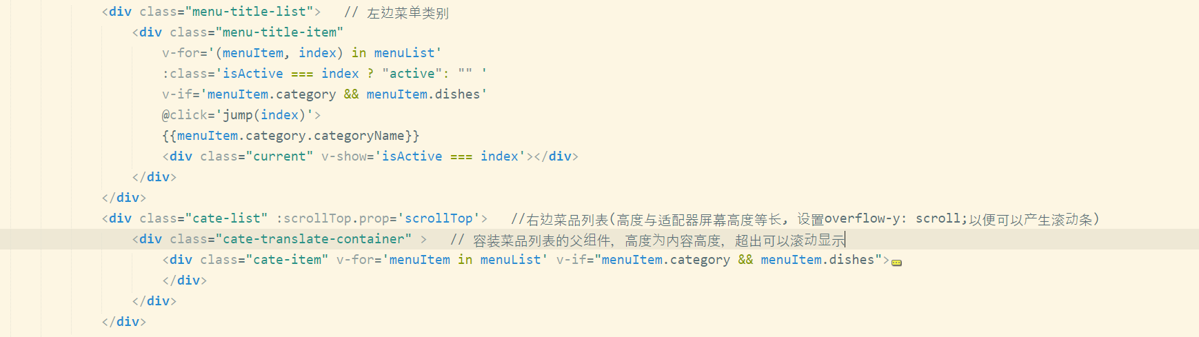 结构布局很简单,在此多说是想给大家讲述清楚一点儿右边菜品的结构,方便绑定:scrollTop属性,小编就踩了这个坑...