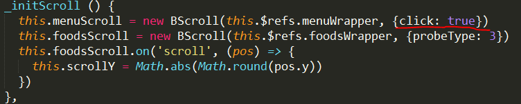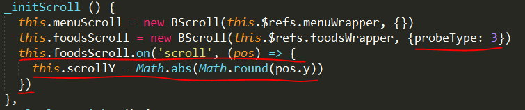 在执行这一步时,scrollY的值,要怎么得到?(通过better-scroll 检测“scroll”事件得到,此时,需要给其加上相应的参数,做法如截图中画红线处所示)
