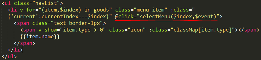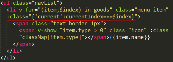 (4)在 template 中,将此index 值绑定到index 值相等的左侧的列表分栏中,并指定一个类名,叫 current,如下图中的 画红线的部分: