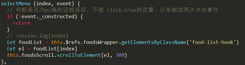 (3)在methods 中编写点击触发的事件 selectMenu()方法,利用 获取的 $index 使右边进行相应的滚动,其中 300ms是加上了一个过渡效果: