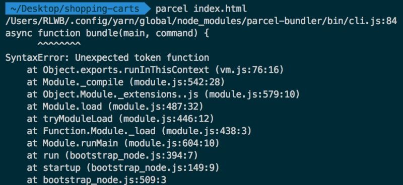 我在仔细检查完代码并且核实项目配置没有问题后,没办法只能求助万能的Google,结果在GitHub上找到了错误的原因,parcel.js使用了Async 函数,默认Node.js 8以上才支持的,低于8的话需要使用babel配置。我查看了一下自己的Node.js版本,如下: