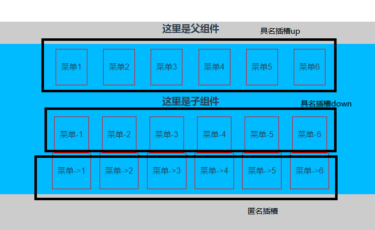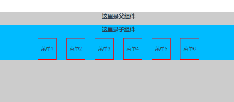 <template> <div class="father"> <h3>这里是父组件</h3> <child> <div class="tmpl" slot="up"> <span>菜单1</span> <span>菜单2</span> <span>菜单3</span> <span>菜单4</span> <span>菜单5</span> <span>菜单6</span> </div> <div class="tmpl" slot="down"> <span>菜单-1</span> <span>菜单-2</span> <span>菜单-3</span> <span>菜单-4</span> <span>菜单-5</span> <span>菜单-6</span> </div> <div class="tmpl"> <span>菜单->1</span> <span>菜单->2</span> <span>菜单->3</span> <span>菜单->4</span> <span>菜单->5</span> <span>菜单->6</span> </div> </child> </div> </template>