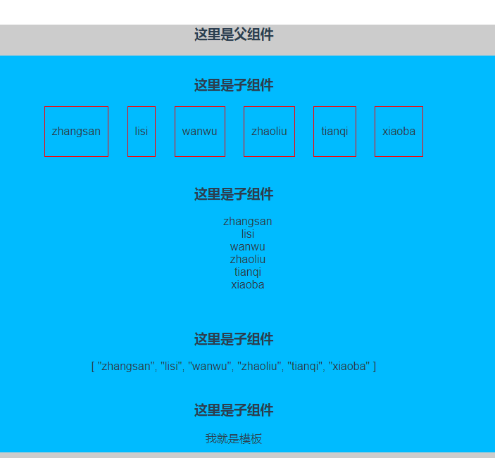 下面的例子,你就能看到,父组件提供了三种样式(分别是flex、ul、直接显示),都没有提供数据,数据使用的都是子组件插槽自己绑定的那个人名数组。