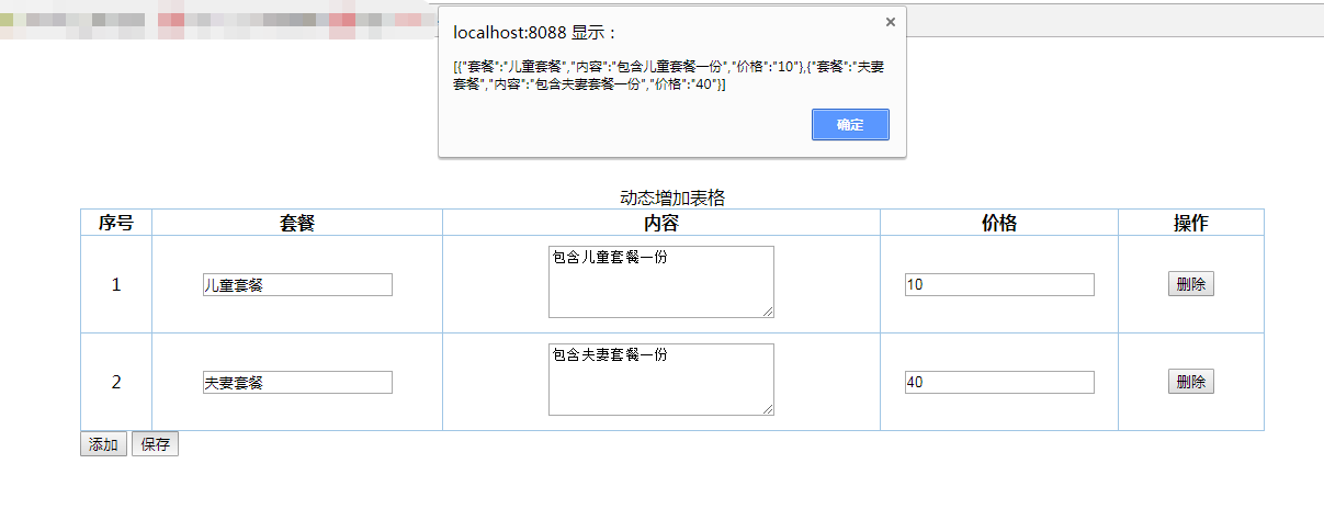 点击说明:点击添加按钮,则表格添加一行,可进行录入,删除按钮,可删除当前行,其他行不影响。删除或者添加,每行的的编号都会自动变化,套餐和价格是<input/>,内容是