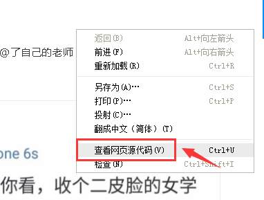 在页面的右键菜单里,选择”查看源“,我的是Google Chrome,这时弹出html源代码的内容