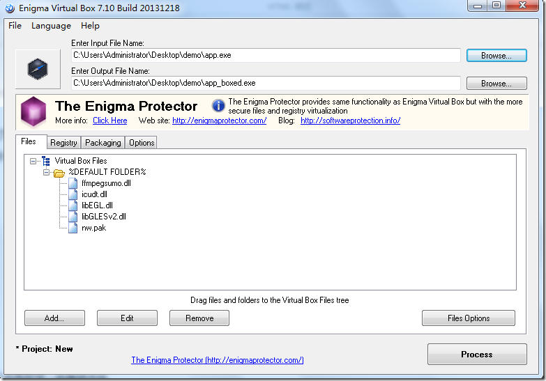 然后在Enter Input File Name那里输入我们的app.exe的路径,在Enter Output File Name那里填写我们要把打包出来的可执行文件输出到哪里。最后是把除app.exe外的其它文件拖入到Files那里,遇到提示的话默认就可以了。