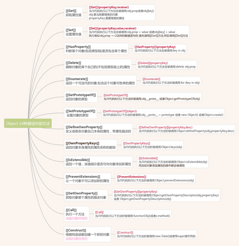 对于JavaScript对象的操作基本上都会调用底层的对象内部方法,我们可以看出在ES6标准中定了14种内部方法.