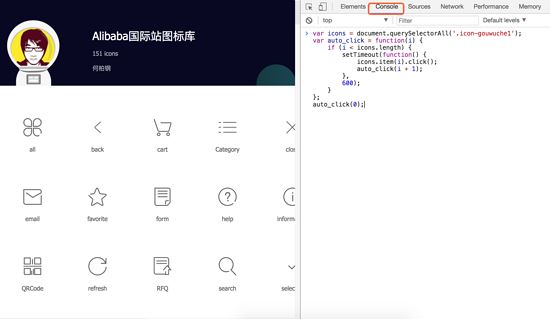 现在我们返回阿里icon首页,点进去你想要的icon库,因为没有批量导入购物车,所以一般情况下需要一个一个去点,太浪费时间,那么请在控制台输入以下代码,批量导入